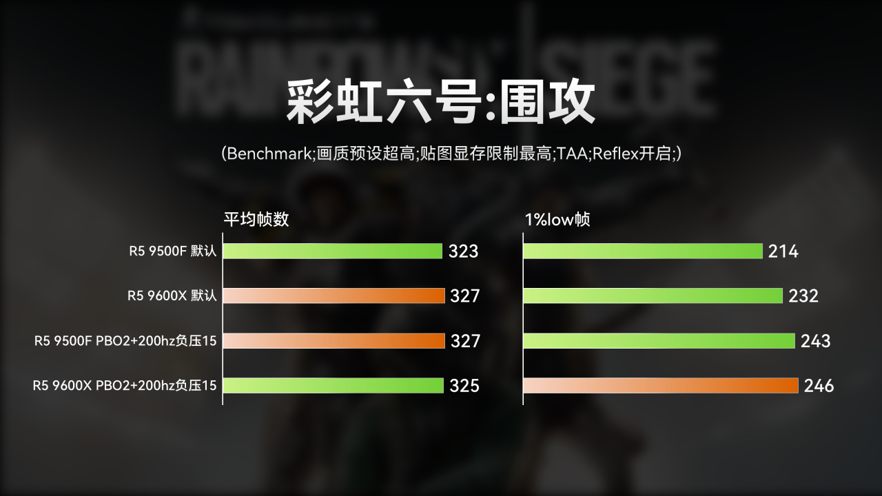 在彩虹六号围攻中,平均帧高度一致都超过了320帧,1%Low帧同样是开了PBO之后大于默认状态。其次9500F开了PBO同样打赢默认状态的9600X,甚至还小胜PBO之后的9600X 2帧。