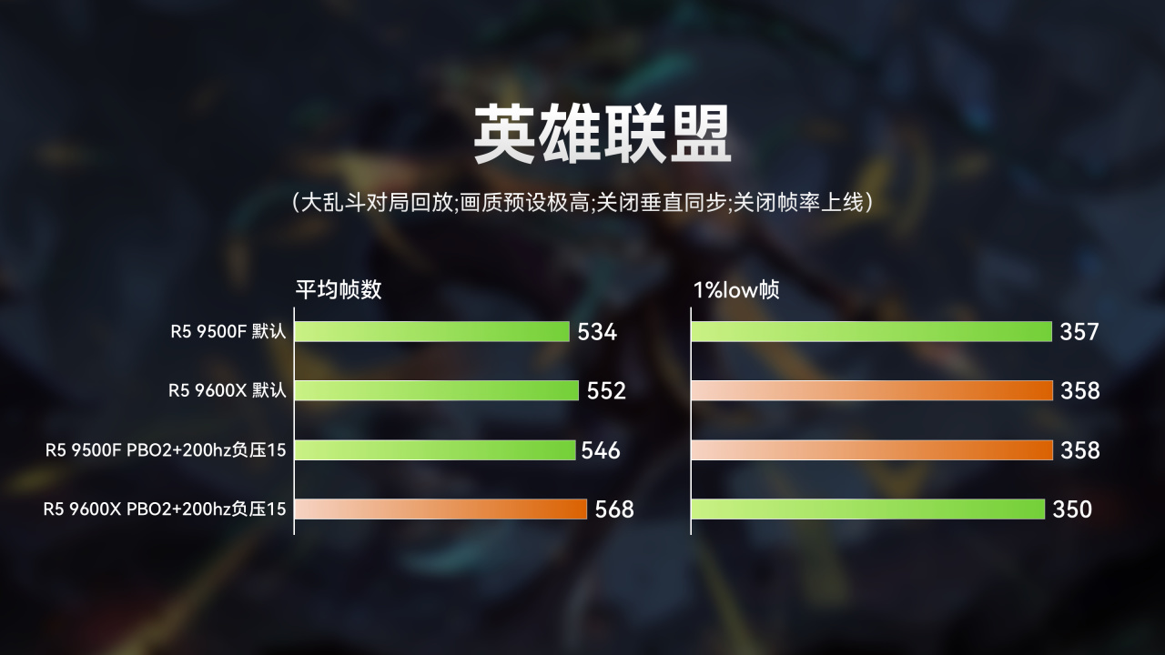 英雄联盟这个游戏优化策略就是单核心性能越强帧率就越高,对于显卡来说够用就好,两款CPU的性能表现高度一致,平均帧550左右,1%Low帧350左右。