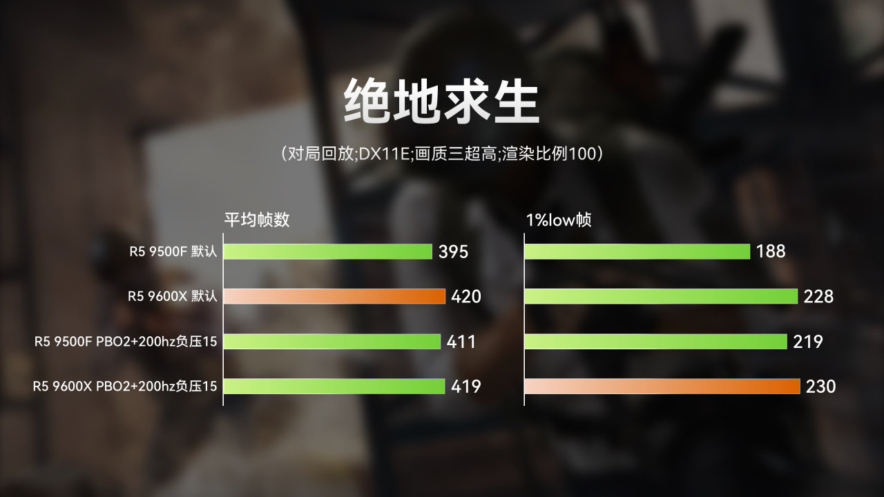 绝地求生中,两款CPU的PBO相比较默认状态都有小幅度的提升,特别是9500F的1%Low帧从188提升到219比较明显,所以各位在使用AMD处理器的时候,可以看看你的PBO到底开了没有。