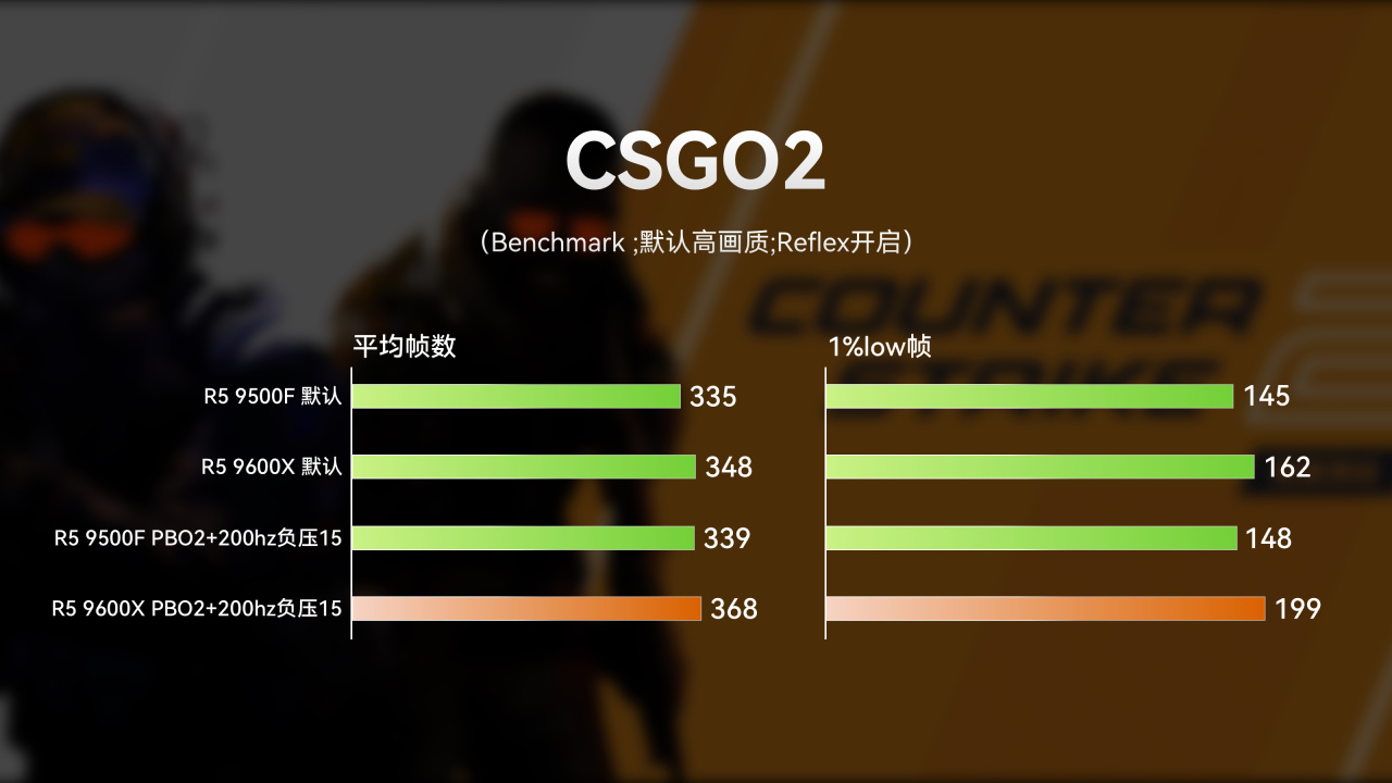 FPS游戏CSGO2中,两款CPU在各种模式下平均都超过了330帧,只有开启PBO的9600X的1%Low帧在200左右,稍微拉开一点点差距,同样是9600X小胜9500F。