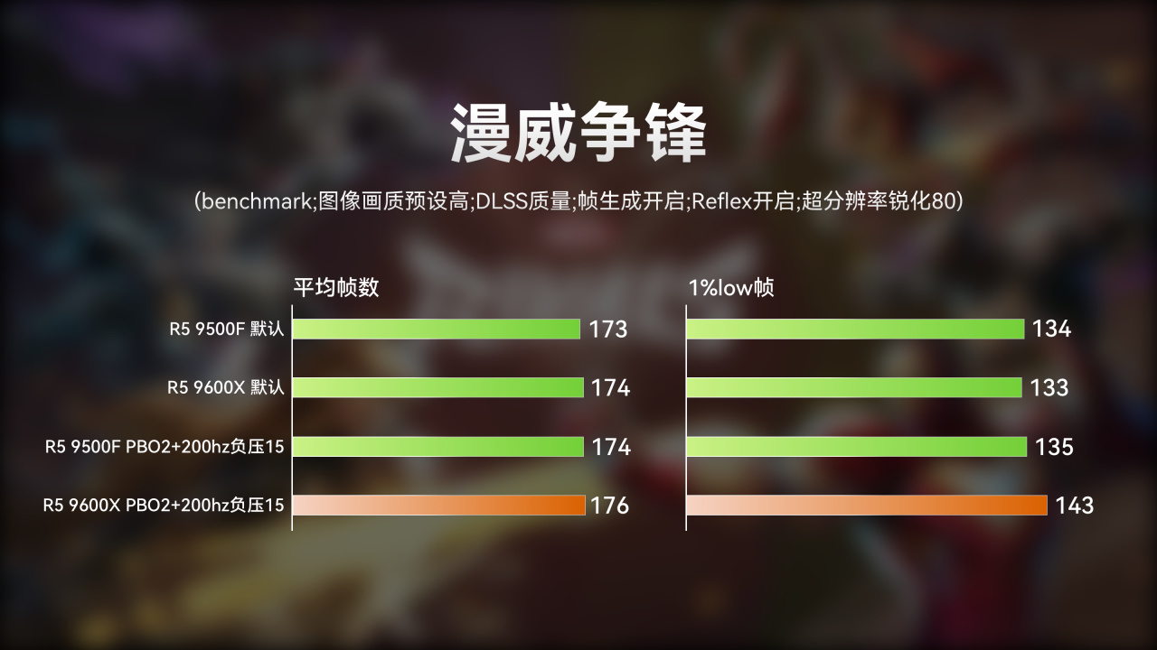最后一款网游漫威争锋中,2款CPU的各个模式下的帧率同样无限接近,平均帧170左右,1%Low帧130左右,只有PBO的9600XLow帧会稍微高一点点。