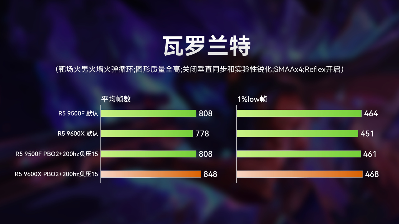 瓦罗兰特中,“哥俩”的表现都在800左右,1%Low帧也都在450帧以上。开启PBO的9500F在这个游戏里打过了默认状态下的9600X,但在这个帧率下,差距堪比“赛博斗蛐蛐”。