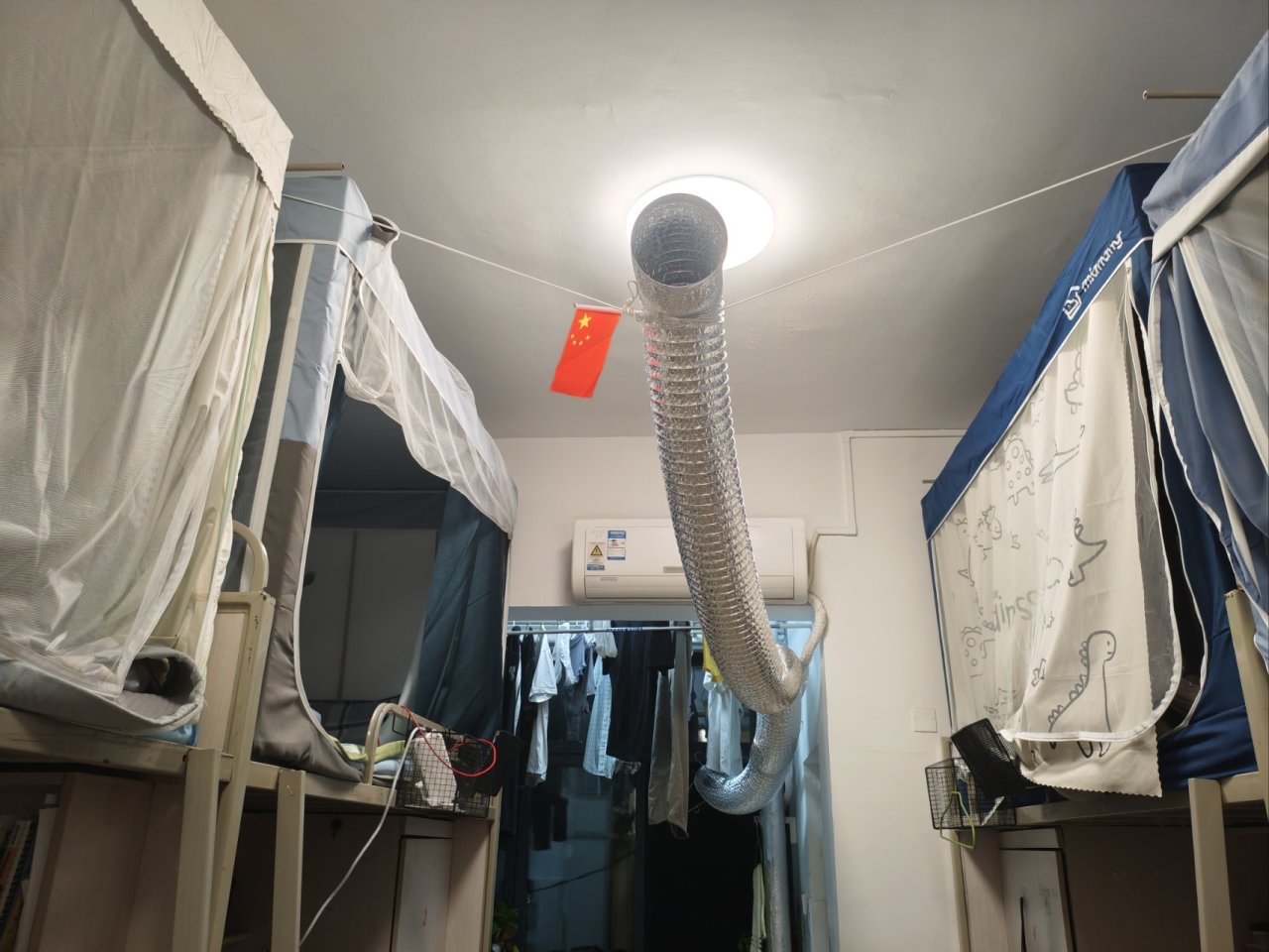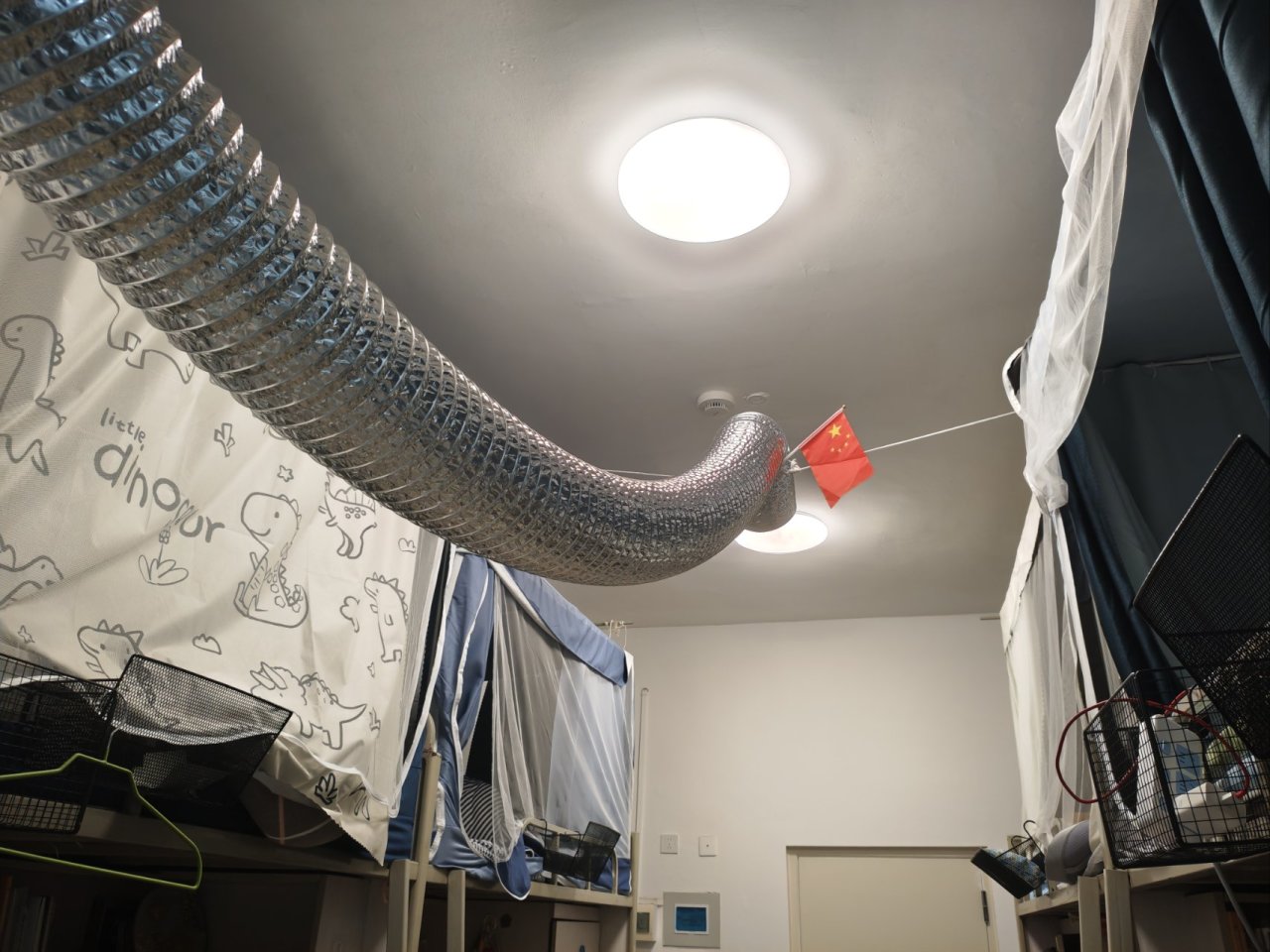 宿舍门一关上屋子里就很闷热,一点也不通风,所以lz和舍友用 风扇和抽油烟机的管道 一起搞了个“新风系统”。