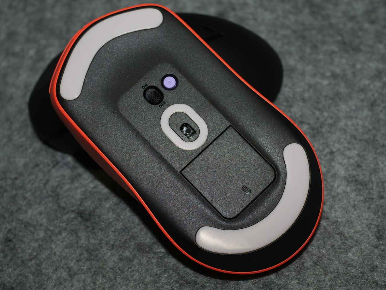 底部可以看到雷柏的老传统,收纳仓磁吸仓盖,主要还是为了适配他们家的无线充电方案,目前他们家的无线充电方案可以说是非常通用,单独的无线充电模块和一步到位的充电底座全都有,感兴趣的朋友可以多了解一下这方面,仓盖上方就是传感器了,传感器上方为鼠标开关以及一个自定义按键。