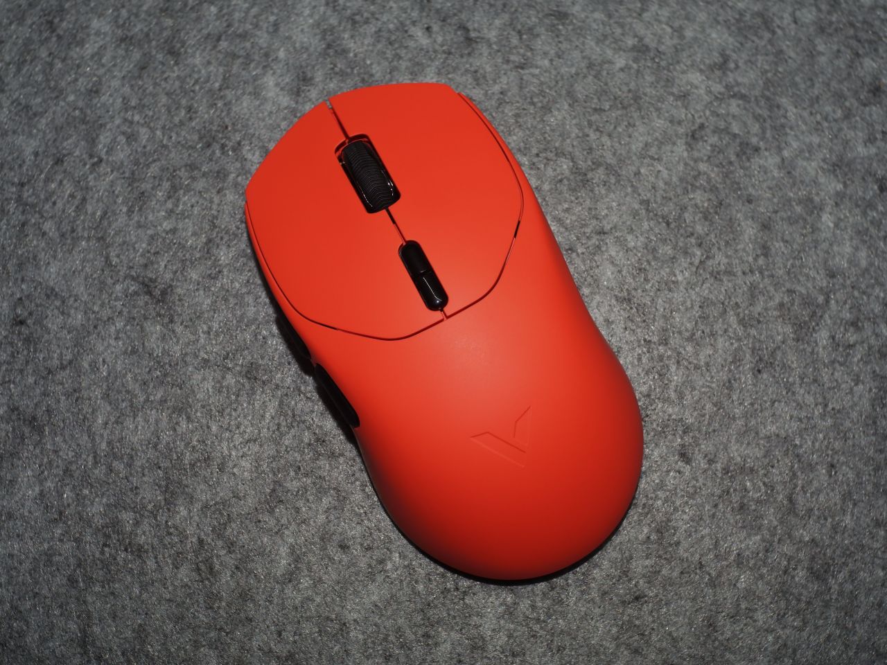 VT1系列是采用了一个适合中小手的右手对称模具,三围119*62*38mm,左右按键有微平的导向槽,左右侧收腰比较轻,背部比较低,使得在趴握的时候也不会顶到手心,而且尾部弧度比较圆润,可以很好的支撑掌根和大鱼际,相较于一代,这次的侧键位置也做了调节,使用时更不易误触,不论是趴握、抓握还是指握都可以获得不错的使用体验。