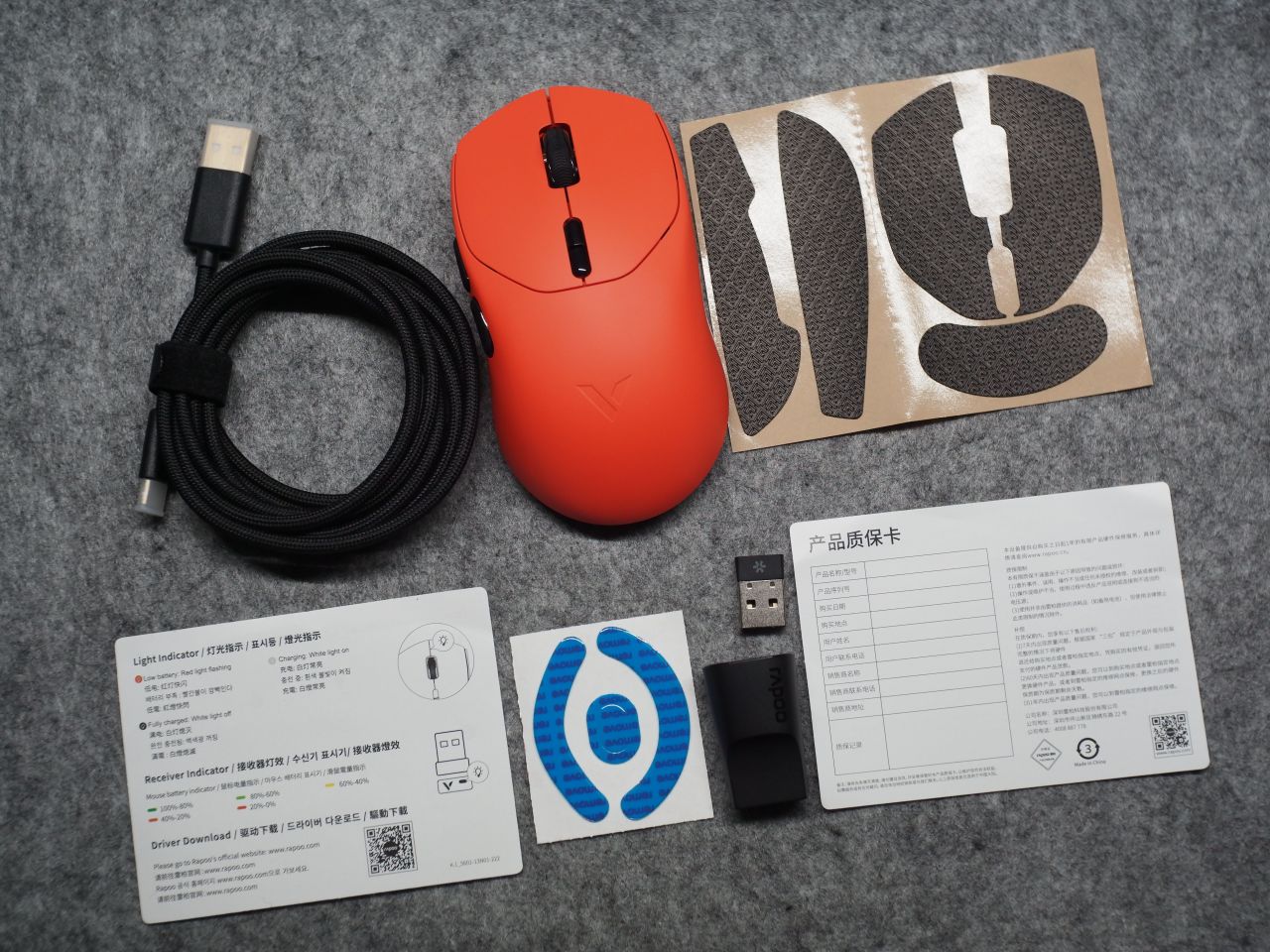 外包装也是VT二代的家族通用外包装,封皮依旧是沿用了自VT9 Air以来的镭射效果,右边是一个“V”的字符,抽掉之后依旧是他们家传统的翻盖盒子,打开之后就可以看到鼠标本体和所有配件了。
