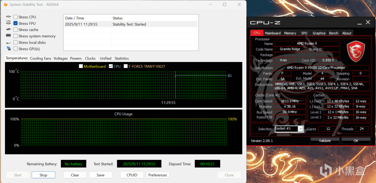 紧接着我们再进行一下烤机测试,在烤机测试时,AMD 锐龙9-9900X在PBO超频下,可以稳定在85°C持久运行,此时全核均为3.8GHz。