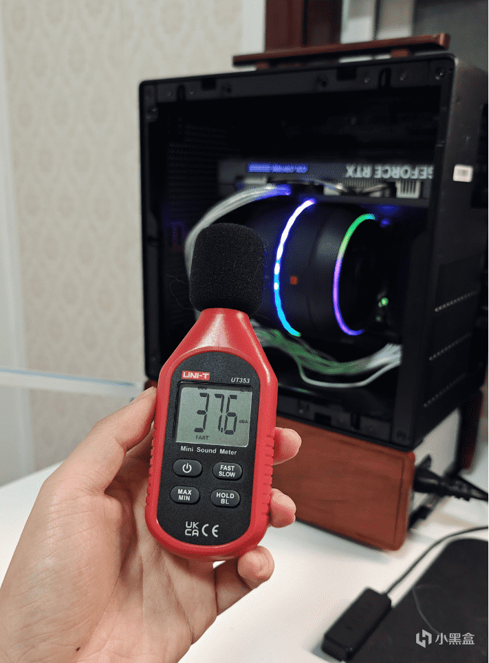 我们先来看一看zalman思民 ZET5涡流散热器的工作噪音,实测距离机箱40cm左右,即模拟玩家实际耳朵所在位子附近时,音量约为37.6dBA,基本等同于我家的环境噪音,也就是说,我不故意去辨认,是不会听到这款涡流散热器的噪音的。