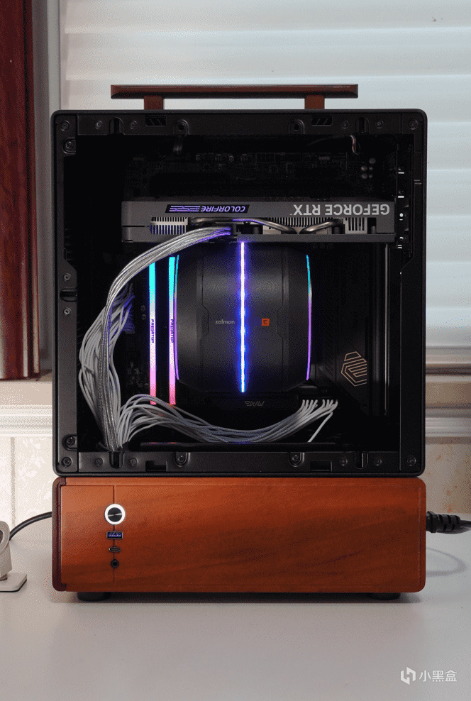 紧接着我们就把zalman思民 ZET5涡流散热器装进机箱中进行测试吧,本次装机,使用的是乔思伯 T7 M-ATX机箱,这是一款大量使用实木材质的机箱,让机箱显得更加温润,不再只有冷冰冰的科技感。同时机箱前部有大量透气镂空,方便进气,配合着zalman思民 ZET5涡流散热器这种纵向排风的散热器,可以直接将CPU产生的热量排出机箱,避免了闷罐情况的发生。
