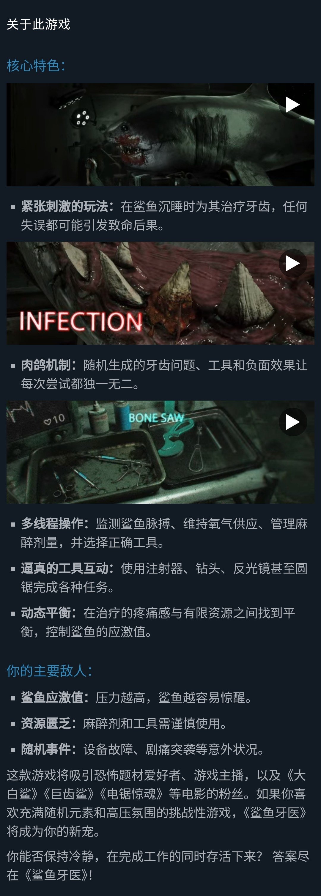 《鯊魚牙醫》(Shark Dentist)是一款獨特的恐怖肉鴿遊戲,你將扮演一名鯊魚牙醫。任務是在陰暗的診所裏爲巨型掠食者治療牙齒,同時避免它們致命的攻擊。通過權衡策略、運氣和有限資源,在保住自己性命的同時治癒患者。