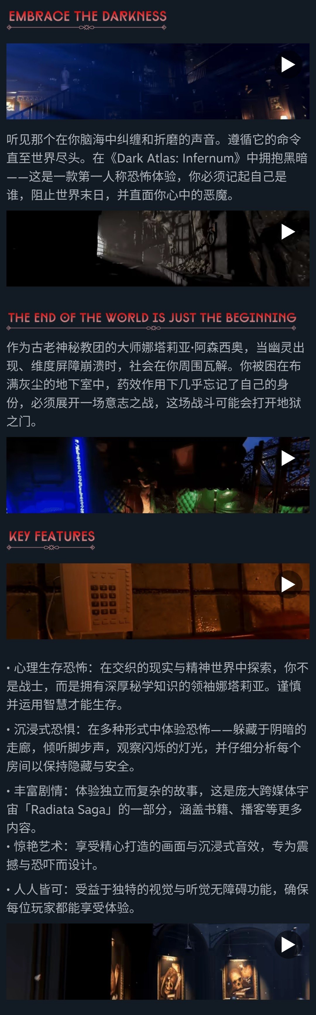 如果地獄是靈魂的狀態,那麼這些步驟將引領你走向它的大門。Dark Atlas: Infernum 是一個令人不安的第一人稱故事,在其中,神祕的世界末日與心理生存恐怖交織,並具有強烈的敘事元素。