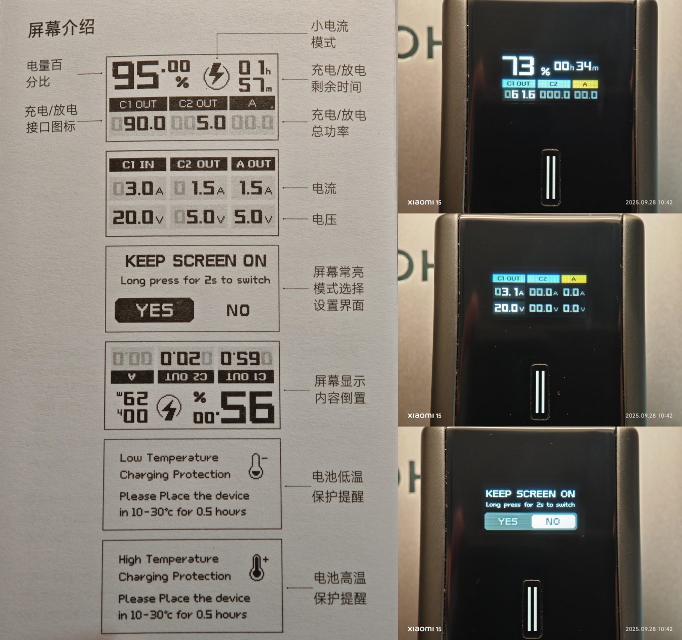 与10号一样,充电宝上段内嵌一个的3.5寸的TFT彩屏(这个屏幕比10号亮),屏幕显示剩余电量,充电功率等。在10号的基础上还新增了电池温度保护提醒,细节拉满了。