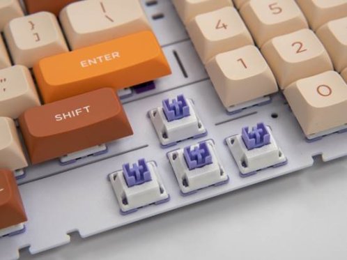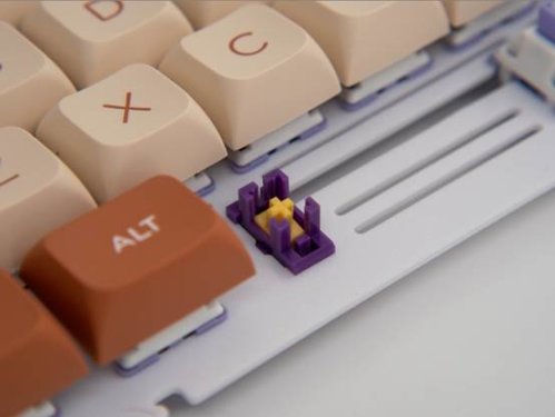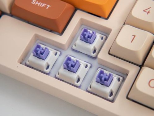 实际手感也和这次的配色一样松软,像按在刚出炉热乎乎的面包上一样。卫星轴继续沿用之前的「紫金」卫星轴,Caps键和左Shift键略有杂音,但空格声音和手感却优秀的出奇。