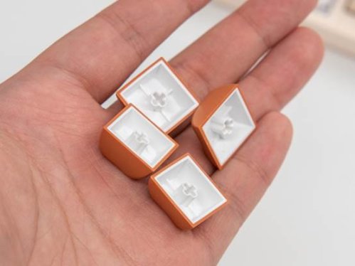 外壳和主要键位都是松软的乳白色,像刚出炉的面包一样;大键则以棕红色作为点缀,对应提拉米苏上那薄薄一层的可可粉;Enter和ESC用了橙黄色来增加整个键盘的亮度和活跃感。