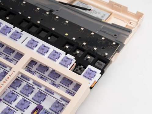 内部采用硅胶Gas结构,定位板材质为白色开槽PC,虽然同是GAS结构但A98青春版的手感并不如使用围栏GAS的A87Pro那样软弹,手感要更偏硬一点。