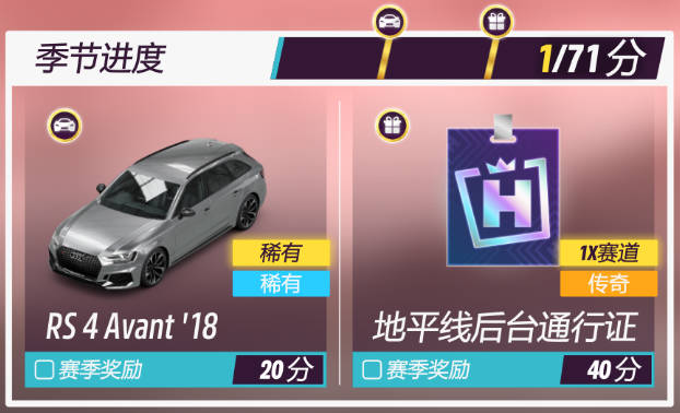 春季賽20分進度獎勵爲2018款奧迪 RS 4 AVANT和40分進度獎勵爲地平線後臺通行證