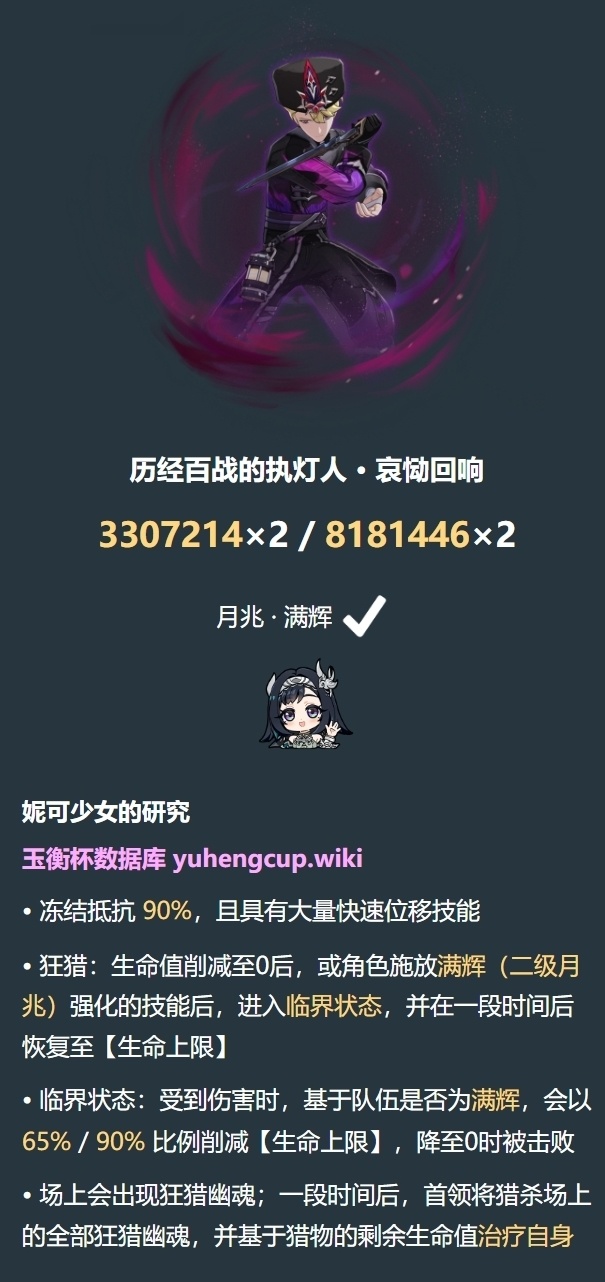 2.当怪物被已被满辉强化的技能命中后或生命值为0后进入临界状态,持续10s(经实战,爱诺Q在满辉时仅在第1下时进入临界状态,后续Q的所有攻击不刷新临界状态持续时间。即使用爱诺时每轮会有约4s的非临界状态)。每次进入临界状态时损失10%生命值上限。(此为所有狂猎怪的共同机制)