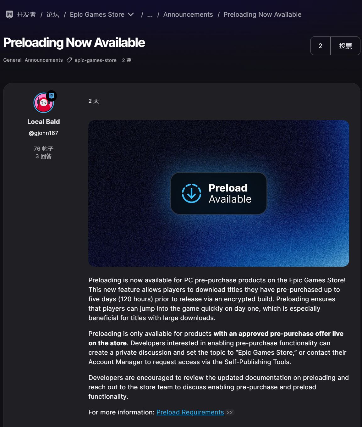 Epic开发人员Local Bald在官方论坛宣布,Epic游戏商店现已为PC端预购游戏开放预载功能!