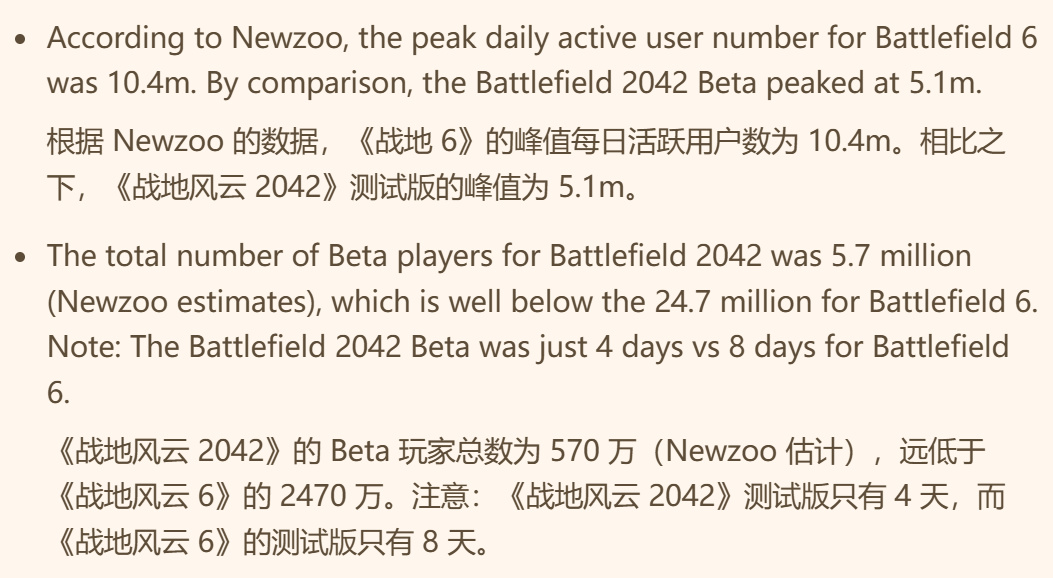 报告中分享的其他值得注意的统计数据包括:Newzoo估计测试版参与玩家数达2500万人,而Ampere的估算略低于此数字,为2200万人。Newzoo还报告称,《战地6》测试版在全平台的同时在线玩家峰值达到1040万,是《战地2042》测试版510万峰值的两倍。