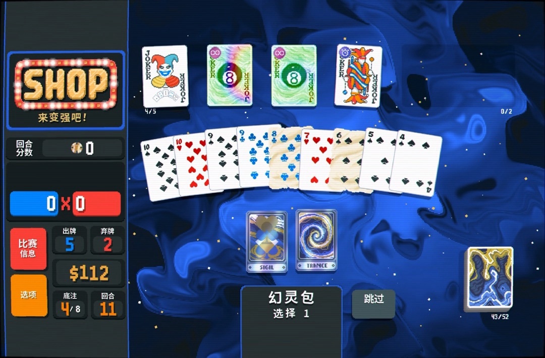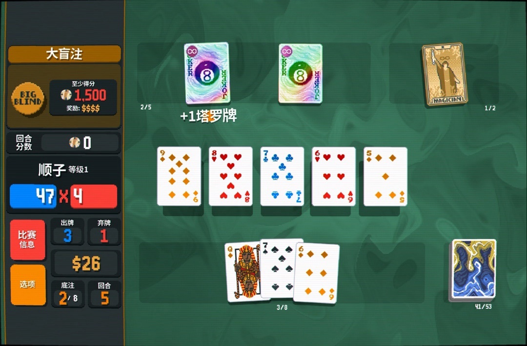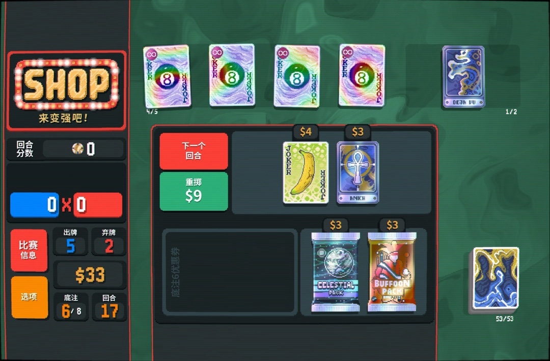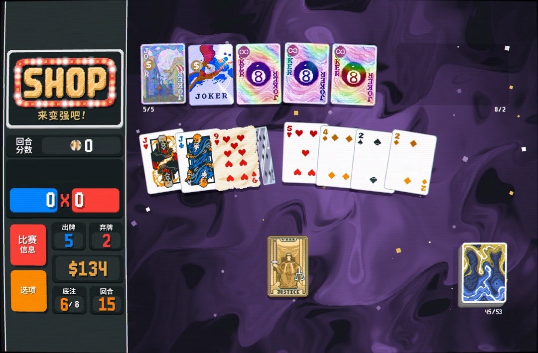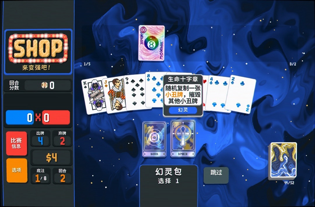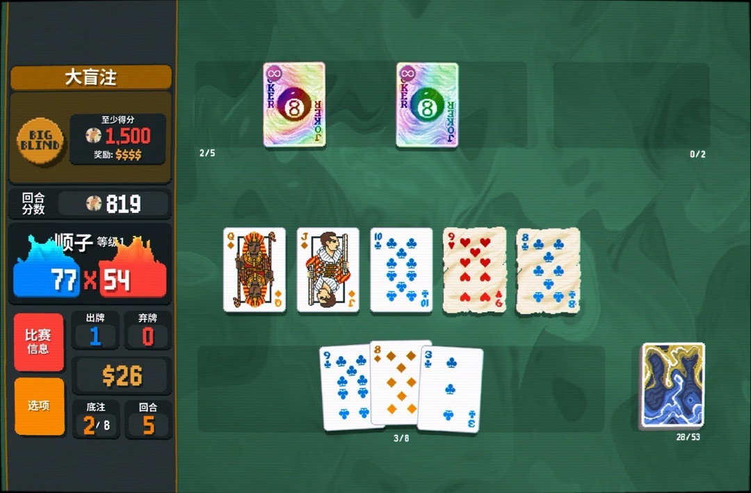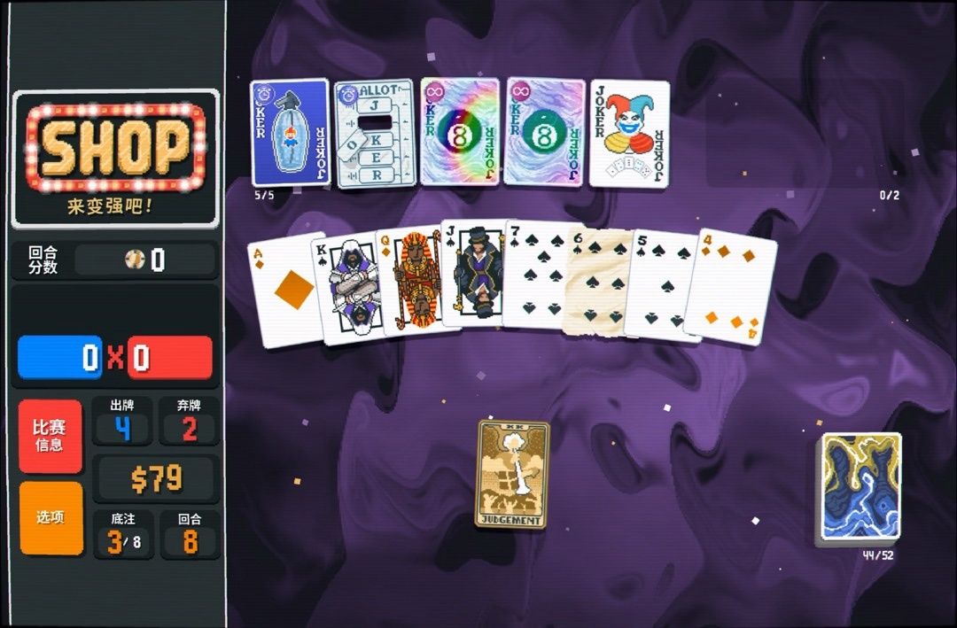 審判給了一張陰險小丑,可能大夥都不知道這小丑是幹啥的,確實沒啥存在感😅總之就是牌型包含順子,籌碼+100。我現在順子等級並不是很高,拿一個加籌碼的小丑還是不錯。