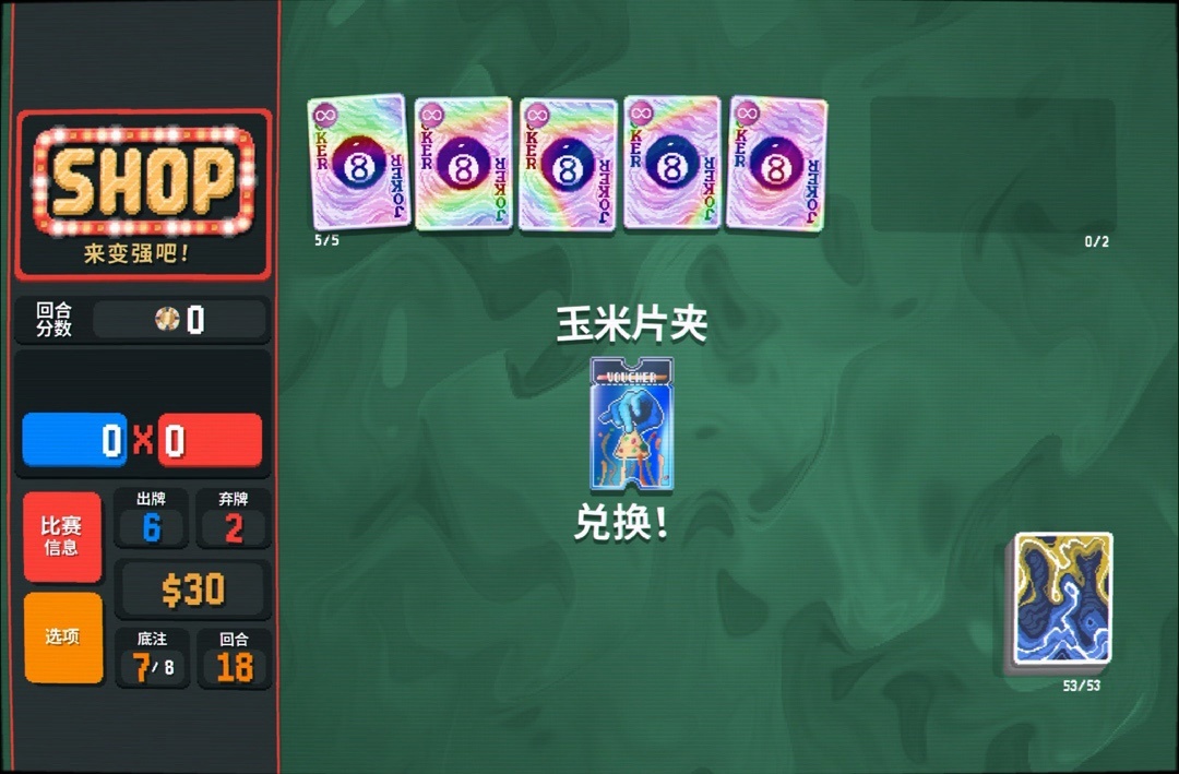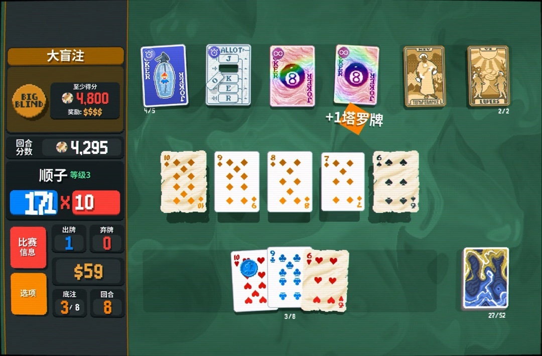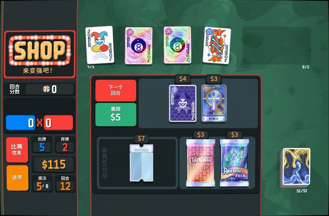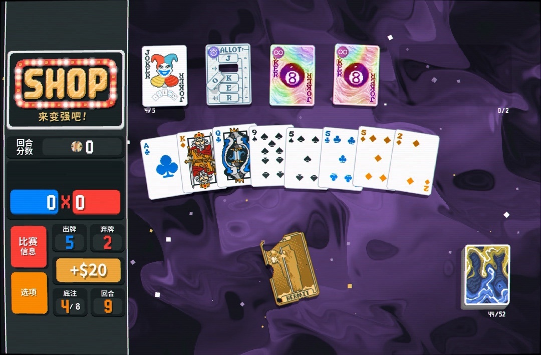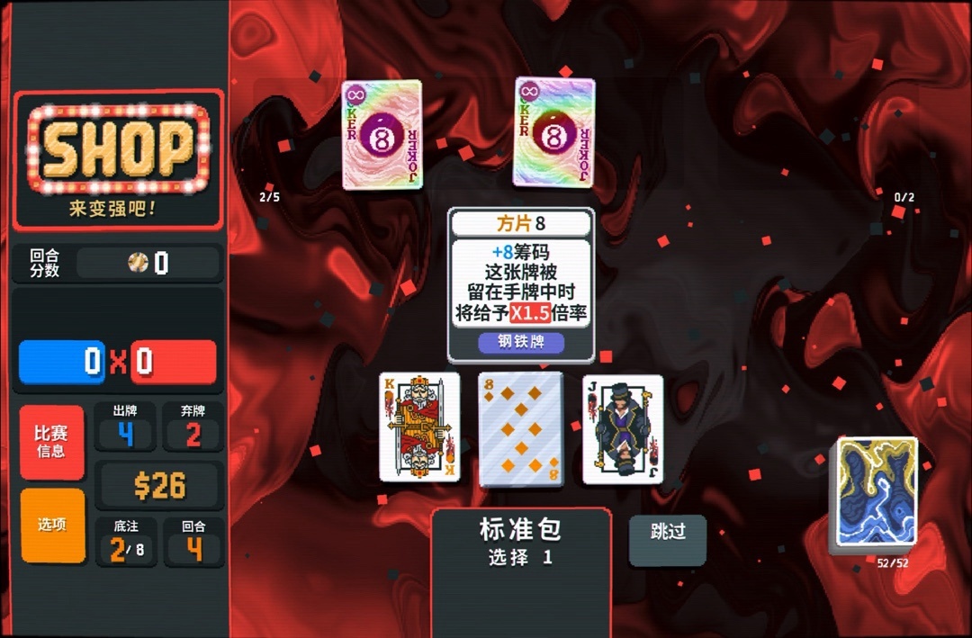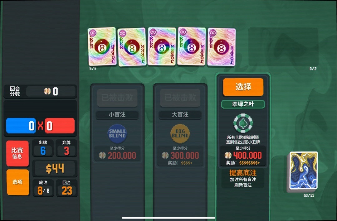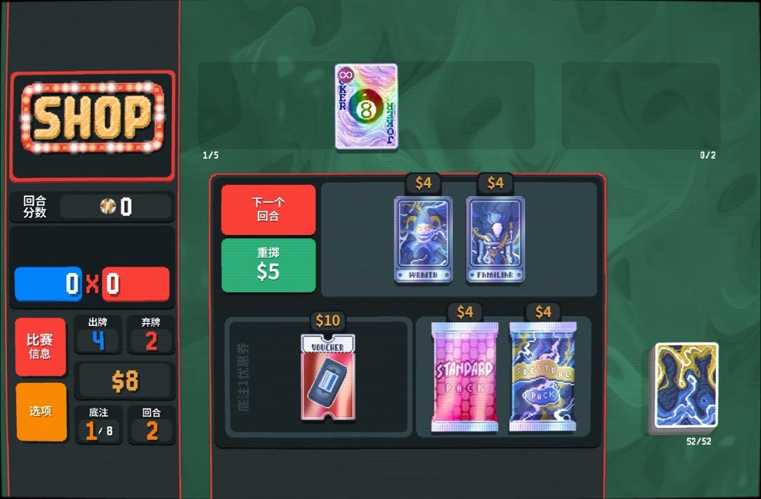 審判給了一張陰險小丑,可能大夥都不知道這小丑是幹啥的,確實沒啥存在感😅總之就是牌型包含順子,籌碼+100。我現在順子等級並不是很高,拿一個加籌碼的小丑還是不錯。