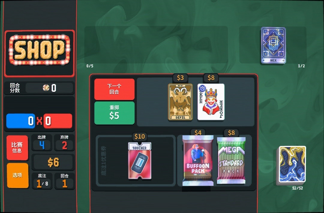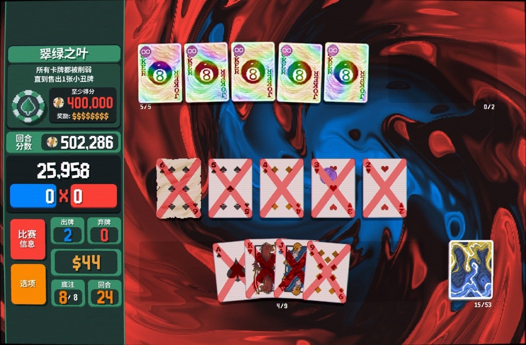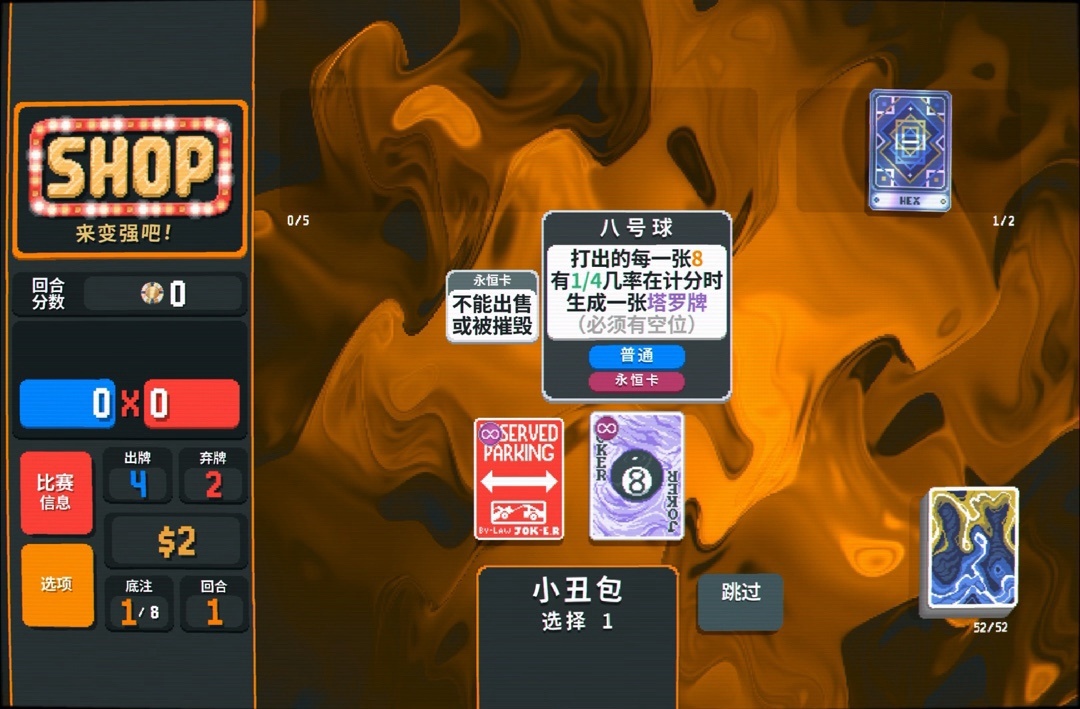 审判给了一张阴险小丑,可能大伙都不知道这小丑是干啥的,确实没啥存在感😅总之就是牌型包含顺子,筹码+100。我现在顺子等级并不是很高,拿一个加筹码的小丑还是不错。