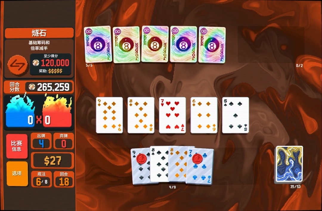 燧石是大牌型殺手,對大牌型(尤其是成長更慢的同花)的基礎分殺傷力非常大。這裏多虧是依靠數值怪順子+多張鋼鐵和紅印,有驚無險。