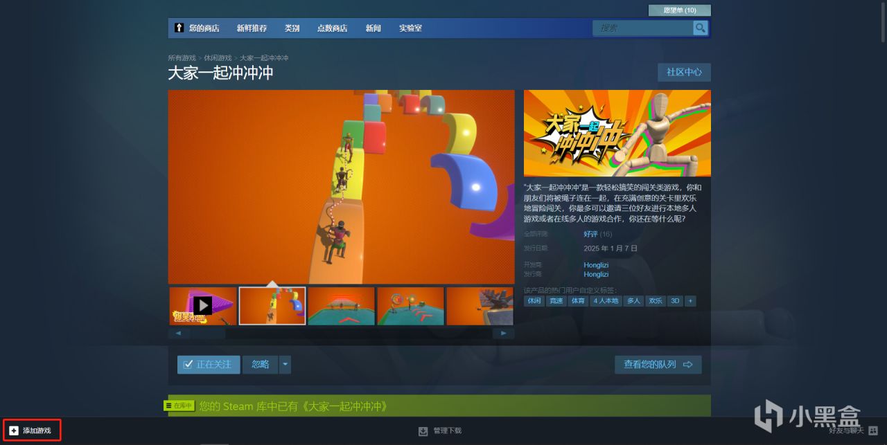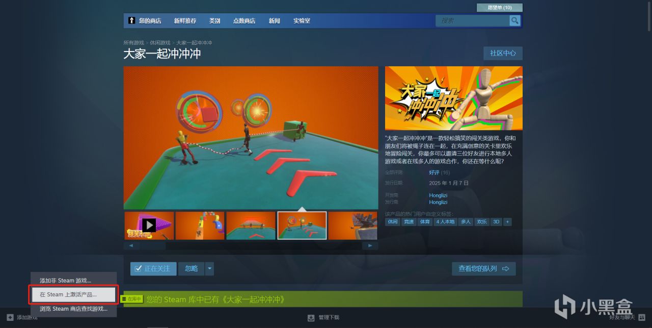 然后大家收到CDKey后,就可以打开Steam,在左下角点击添加游戏。