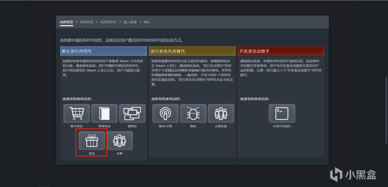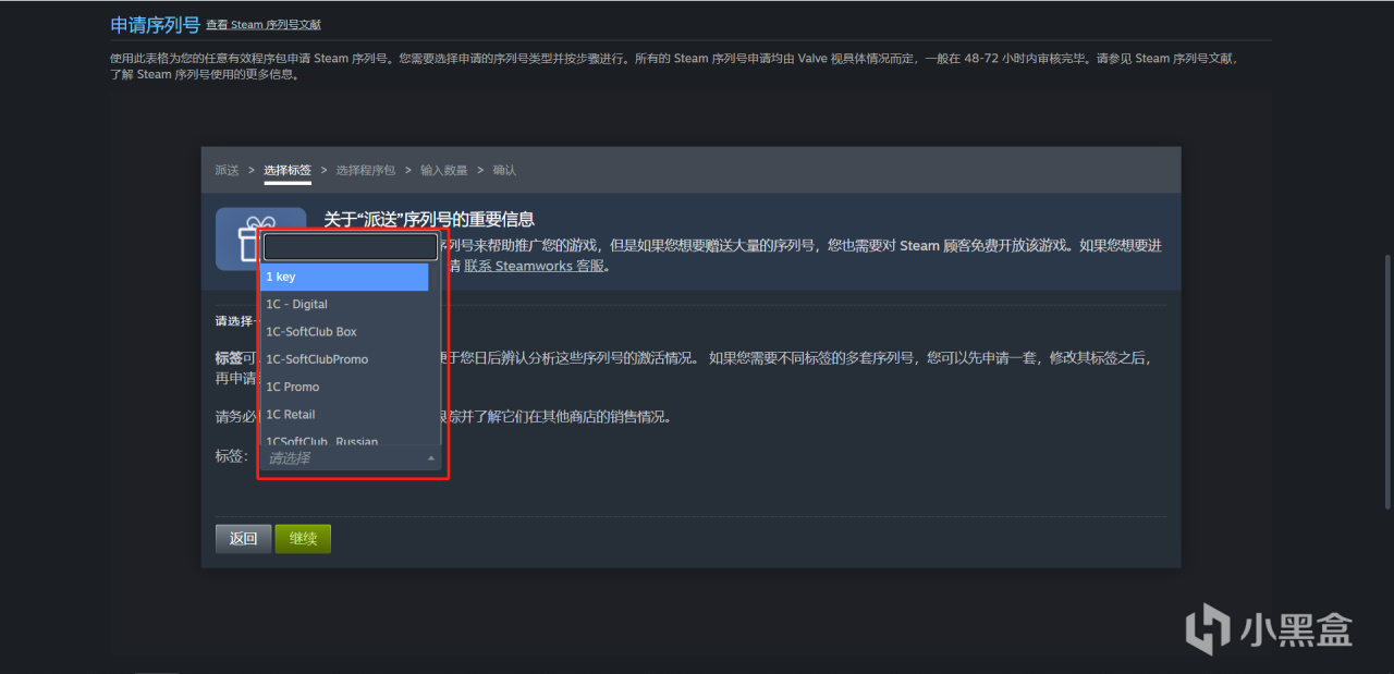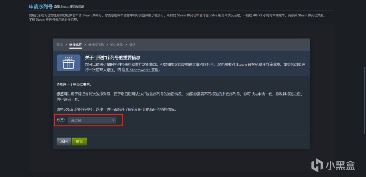 点击进去以后呢,需要给这个派送的CDKey选择一个特别的标签,便于日后分析。