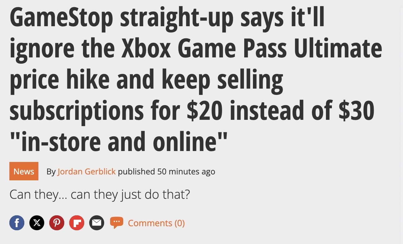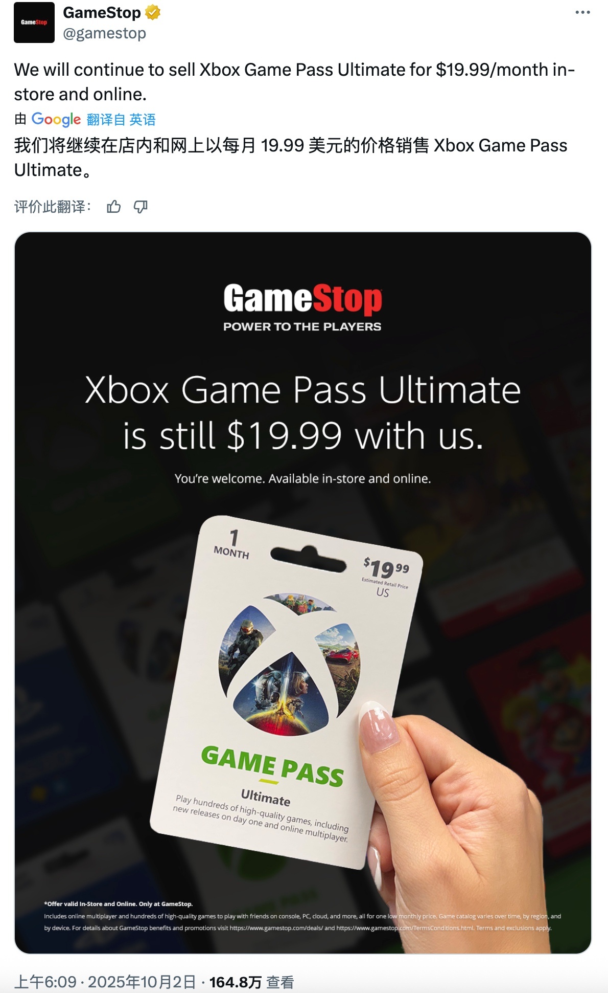 GameStop直接表示,它将忽略Xbox Game Pass Ultimate的价格上涨,并继续以20美元而不是30美元的“实体店和在线”价格销售订阅