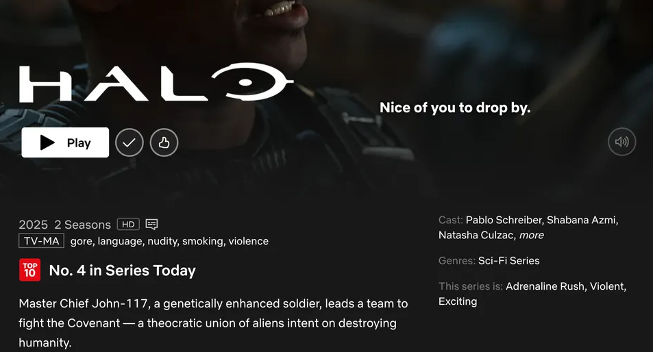 Paramount+取消的《光環》(Halo)劇集在Netflix上迎來新生,迅速躋身熱門行列。目前,該劇在美國Netflix排行榜上位列第四最受歡迎電視劇。