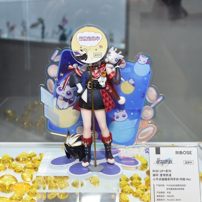 这款模型是 RISE UP系列 的一员,不仅忠实还原了托帕的服装细节,可爱的“账账”造型也十分引人注目。现场展出的信息牌显示了该模型的材质为PVC&ABS,并注明了角色名与系列名。