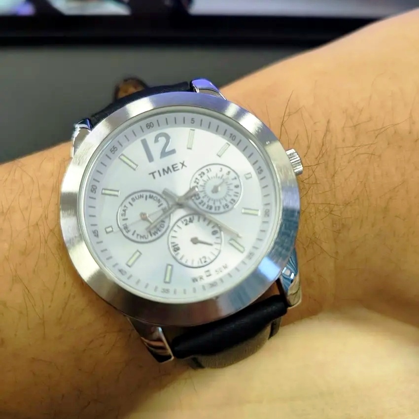 天美時t49905三眼時針。淘寶官方售價六百多,比較貴,但是閒魚二手不到200就可以找到成色不錯的。表面大氣,聲音很小,比上一款明顯更加細膩,缺點是這三個錶盤基本用不到。再一個它的皮錶帶很不耐用,基本一年就不行了。