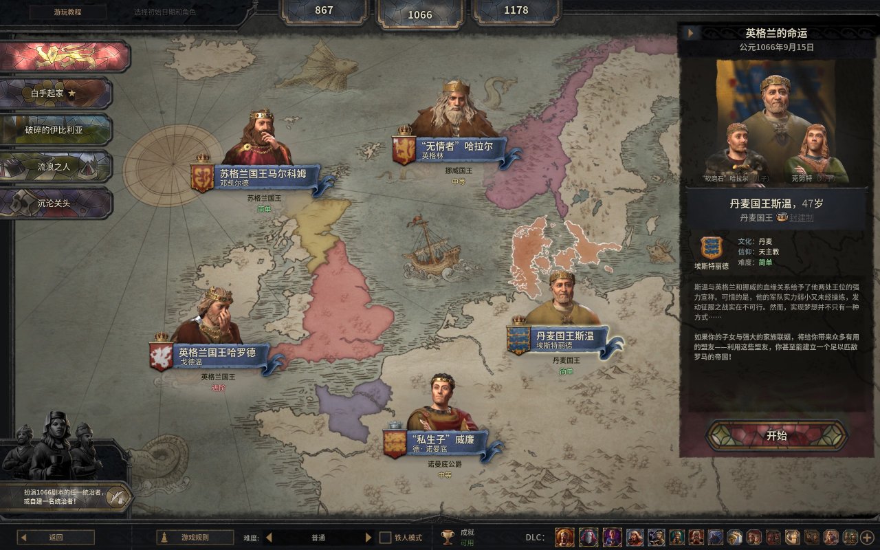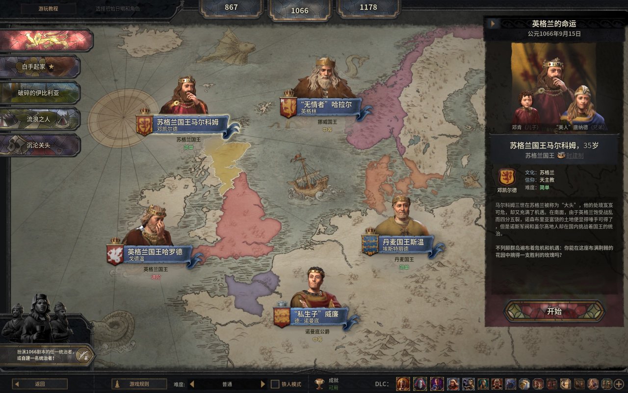 攻略;表面简单局,实则坐牢局,缺少财政收入,自己最大的封臣是自己的仇人(马里公爵是乔阿伦家族,也就是麦克白的亲属),巩固中央权利,然后慢慢蚕食爱尔兰和威尔士,最后拿下英格兰,才有一展宏图的希望。