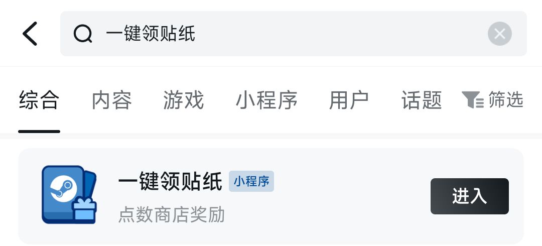 ①小黑盒搜索「一鍵領貼紙」,進入小程序一鍵領取