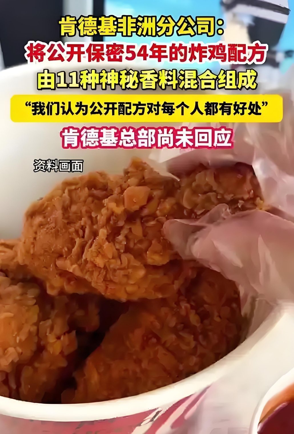 肯德基非洲分公司近日宣布,将于10月8日公开备受瞩目的炸鸡配方,该配方作为商业机密已保密54年,历来只有公司极少数高层知晓。肯德基非洲分公司首席营销和数字官格兰特·麦克弗森表示:“多年来,人们一直在向我们询问秘方。竞争对手竭尽全力去抄袭它。现在我们决定,全世界终于可以分享这份配方了。”