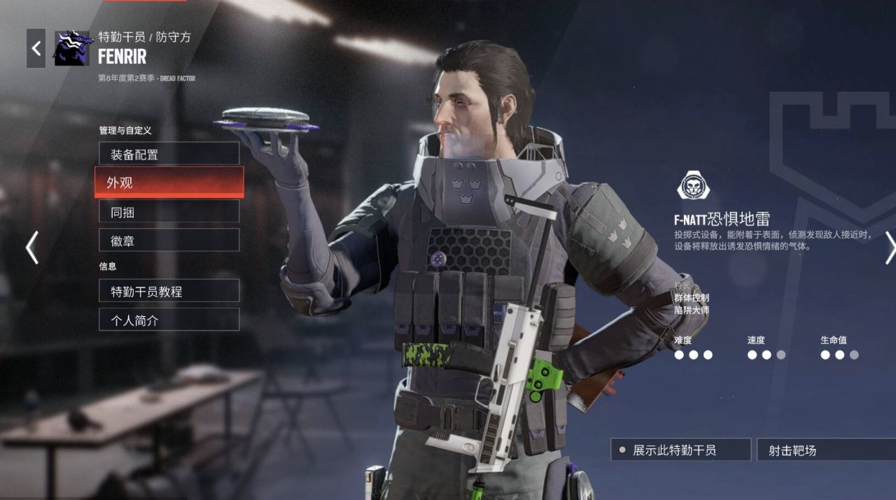 技能名称为“F-NATT恐惧地雷”。为部署在表面启动生效后,敌方进入道具范围内触发的致盲陷阱类装置。