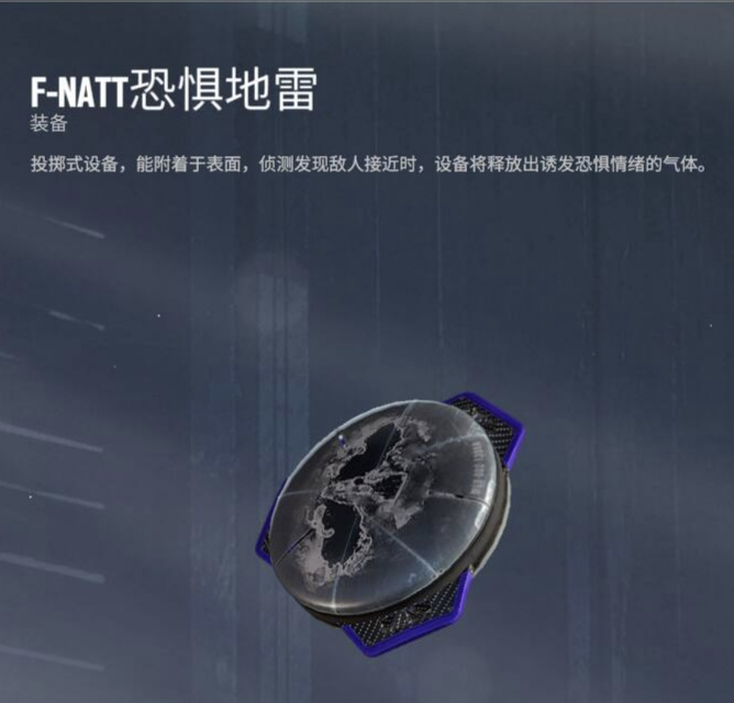 技能名稱爲“F-NATT恐懼地雷”。爲部署在表面啓動生效後,敵方進入道具範圍內觸發的致盲陷阱類裝置。