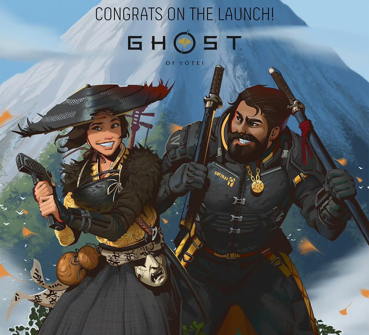 在《羊蹄山之魂》正式公布及发售过程中,索尼旗下工作室纷纷表达支持。顽皮狗、Bend工作室等在游戏压盘时便发来贺电。失眠组(Insomniac Games)热情地表示:“恭喜Sucker Punch的朋友们今天公布了《羊蹄山之魂》!”而圣莫尼卡工作室(Santa Monica)则写道:“热烈祝贺我们Sucker Punch的朋友们!我们迫不及待地想见到你们的新‘战鬼’” 。甚至小岛工作室也以独特方式参与其中——《羊蹄山之魂》女主角演员石井恵梨香参观了小岛工作室,并与标志性角色“Ludens”合影。这种互动超越了简单的文字祝福,体现了开发者之间的深厚情谊。