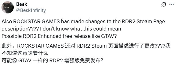 《荒野大镖客2》在SteamDB条目上的新更新表明,Rockstar Games可能正准备宣布这款开放世界游戏的增强版本。这一发现最初由X用户BeskInfinity强调指出,他注意到在Steam数据库更新历史中,游戏的商店描述进行了修订。
