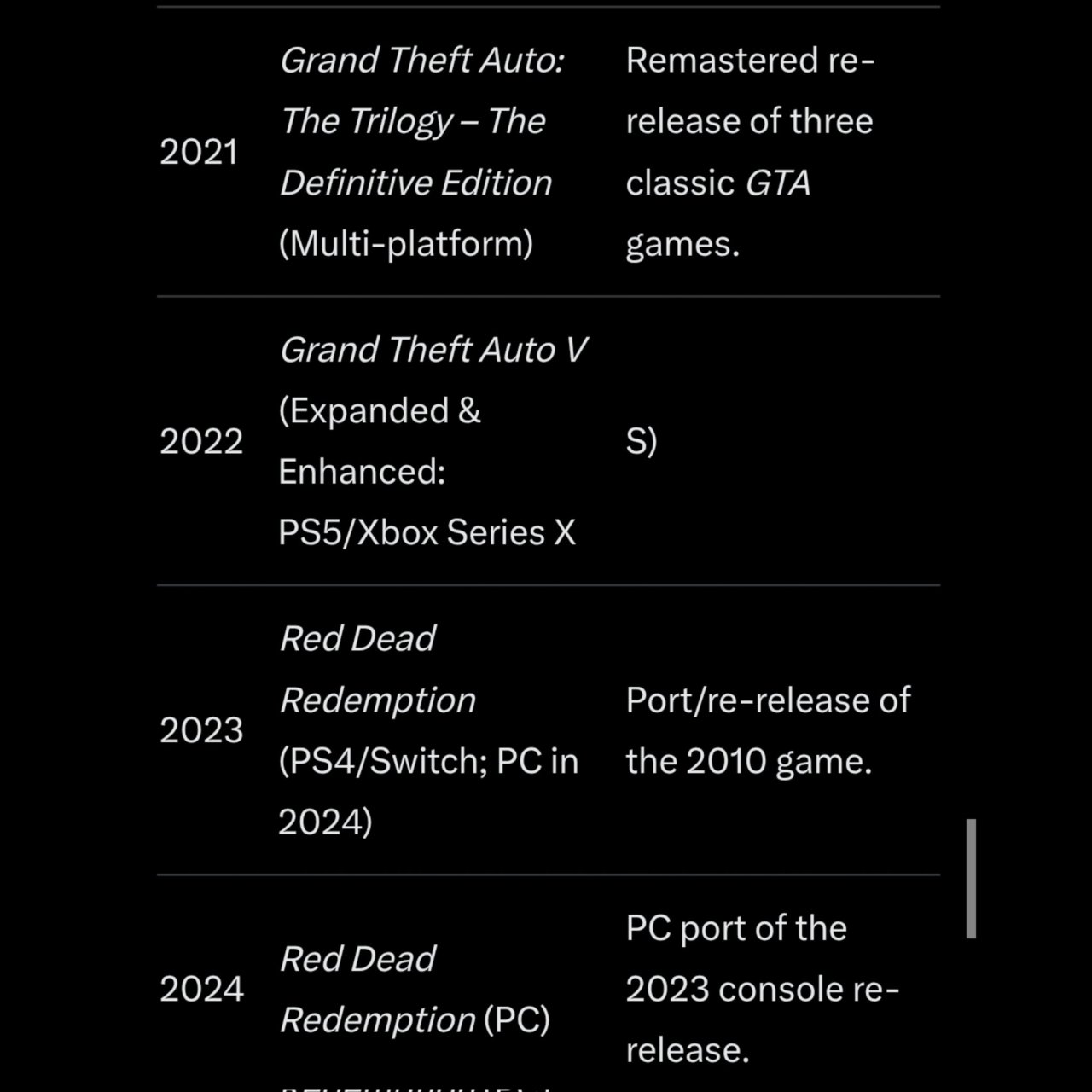 值得注意的是,Rockstar Games自2021年以来一直遵循着每年发布复刻版的固定模式。从《GTA5》的次世代版到《荒野大镖客》的复刻版,该开发商自此保持了每年重新发布一款作品的趋势,直至《GTA6》于2026年5月26日发售。然而,2025年尚未出现这样的重新发布。
