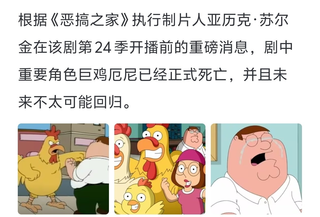 根据《恶搞之家》执行制片人亚历克·苏尔金在该剧第 24 季开播前的重磅消息,剧中重要角色巨鸡厄尼已经正式死亡,并且未来不太可能回归。