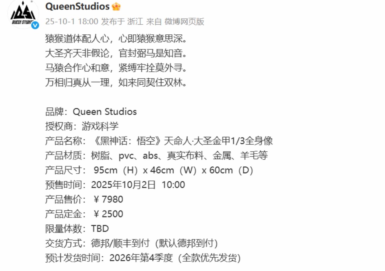 知名雕像厂牌Queen Studios今日正式发布了由游戏科学官方授权的《黑神话:悟空》天命人·大圣金甲1/3比例全身像,售价为7980元。该产品于10月2日上午10点开启预售,定金2500元,预计2026年第四季度发货。