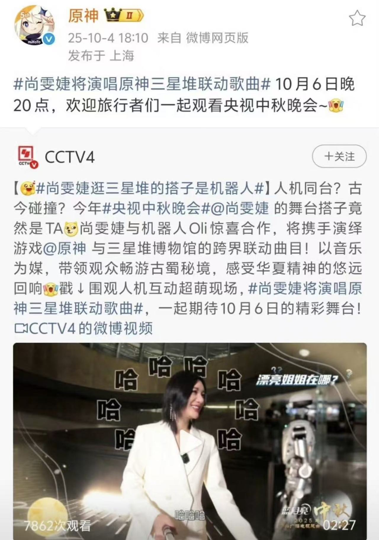 今年央视中秋晚会舞台将迎来一场别开生面的合作——歌手尚雯婕将与机器人Oli同台演绎《原神》与三星堆博物馆的跨界联动曲目。这一创新表演将于10月6日晚8点通过央视多个频道及新媒体平台向全球播出。这一合作源于《原神》与三星堆博物馆的深度联动,两者希望通过音乐与科技的结合,带领观众沉浸式漫游古蜀秘境,感受华夏文明的千年回响。