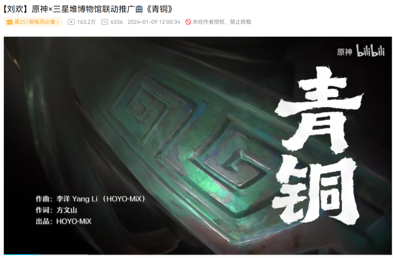 《原神》与三星堆博物馆的合作始于2023年底。双方开展了一系列多样化联动,包括多语种宣传视频《仰观千秋,俯察万象》、文物解说《古物见闻》、文物科普互动H5《开山览物》以及线下打卡活动等。