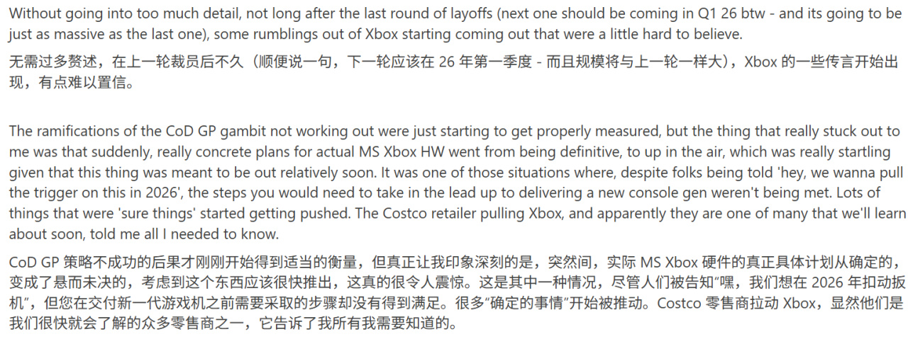 该内部人士还提到了Costco近期决定停售Xbox主机的消息,并声称预计会有更多大型零售商效仿。"Costco下架Xbox产品,而且显然他们只是即将曝光的众多零售商之一,这告诉了我所有需要知道的信息,"他表示。
