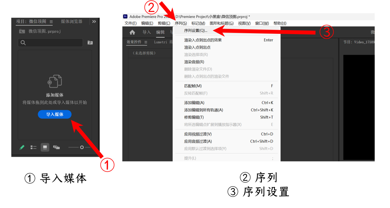 接着左下角“导入媒体”,导入后左键按住媒体拖到右边的时间轴中来创建一个序列,然后左上角选择“序列”,点击“序列设置”