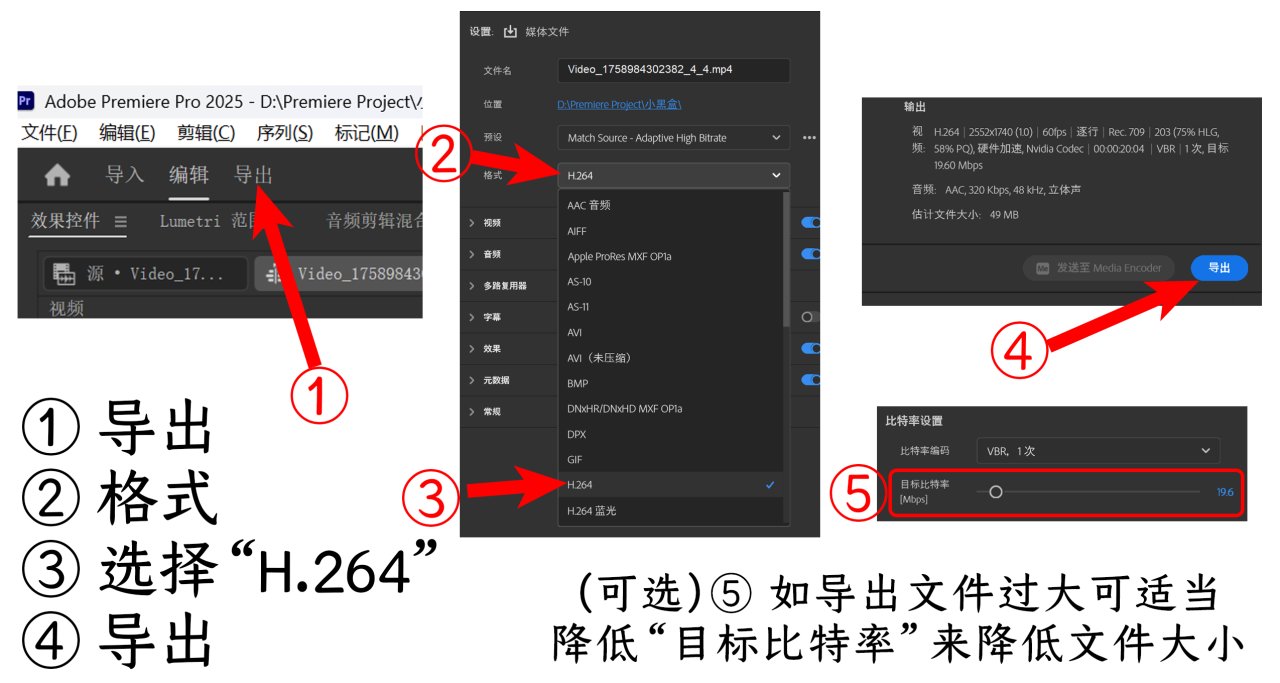 调整好后在左上角点击“导出”,“格式”中选择“H.264”,如果导出文件过大可适当降低“目标比特率”来降低文件大小,然后点击右下角“导出”,这时候22:15的视频就制作完毕了,可以进行下一步操作了(导出的视频一般保存在第2步设置的项目文件夹中)