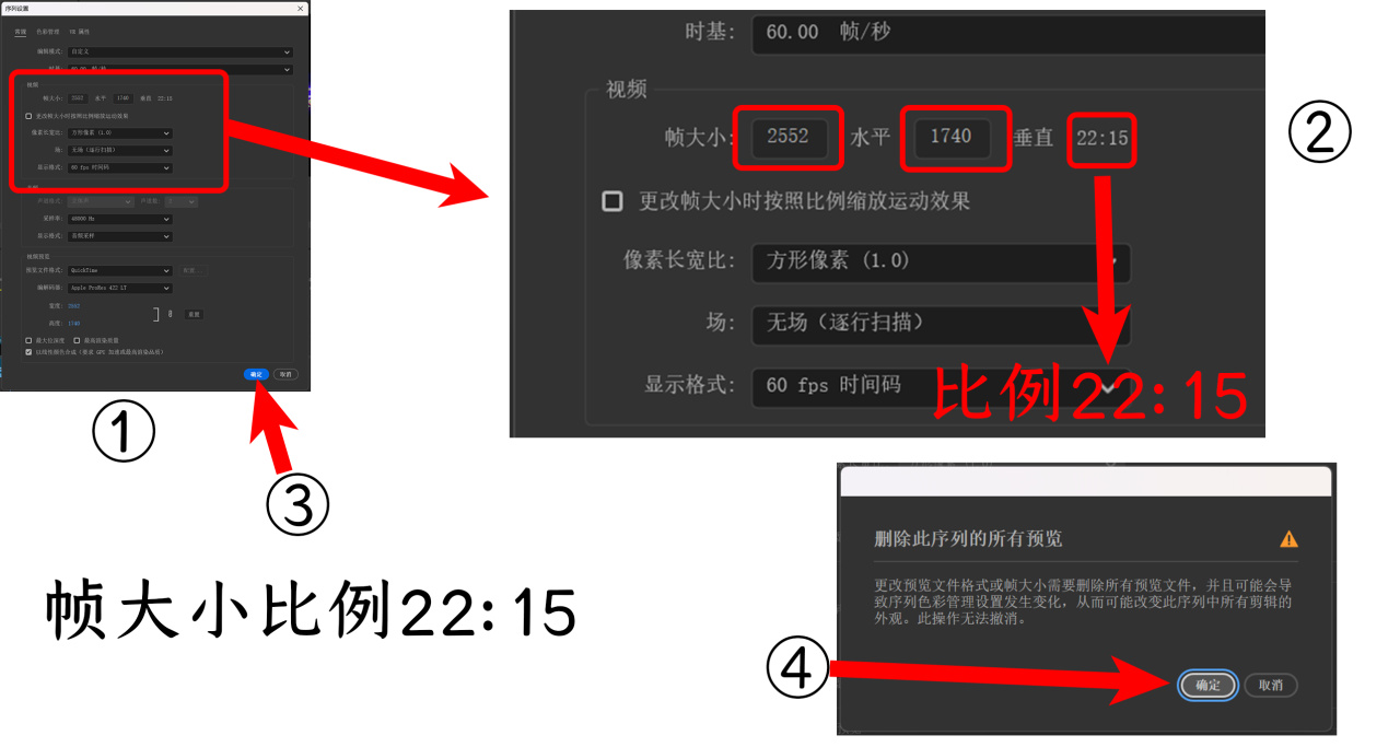 在序列设置中调整“帧大小”,使其比例达到22:15(例如原视频为2560×1440,可通过计算得出 宽度22×116=2552px,高度15×116=1740px,这样能尽量保持视频内容完整),点击“确定”,在“删除此序列的所有预览”中再次点击“确定”