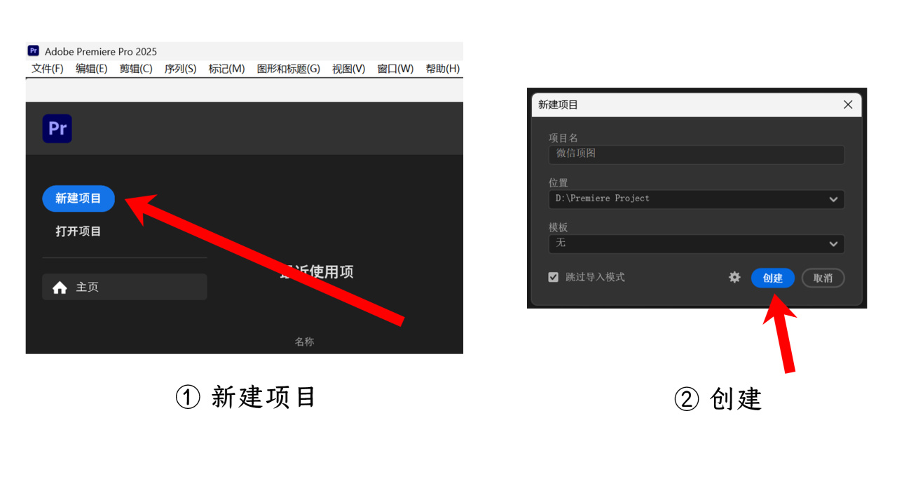 打开Pr,点击“新建项目”,项目名和目录按自己需求填写,点击“创建”